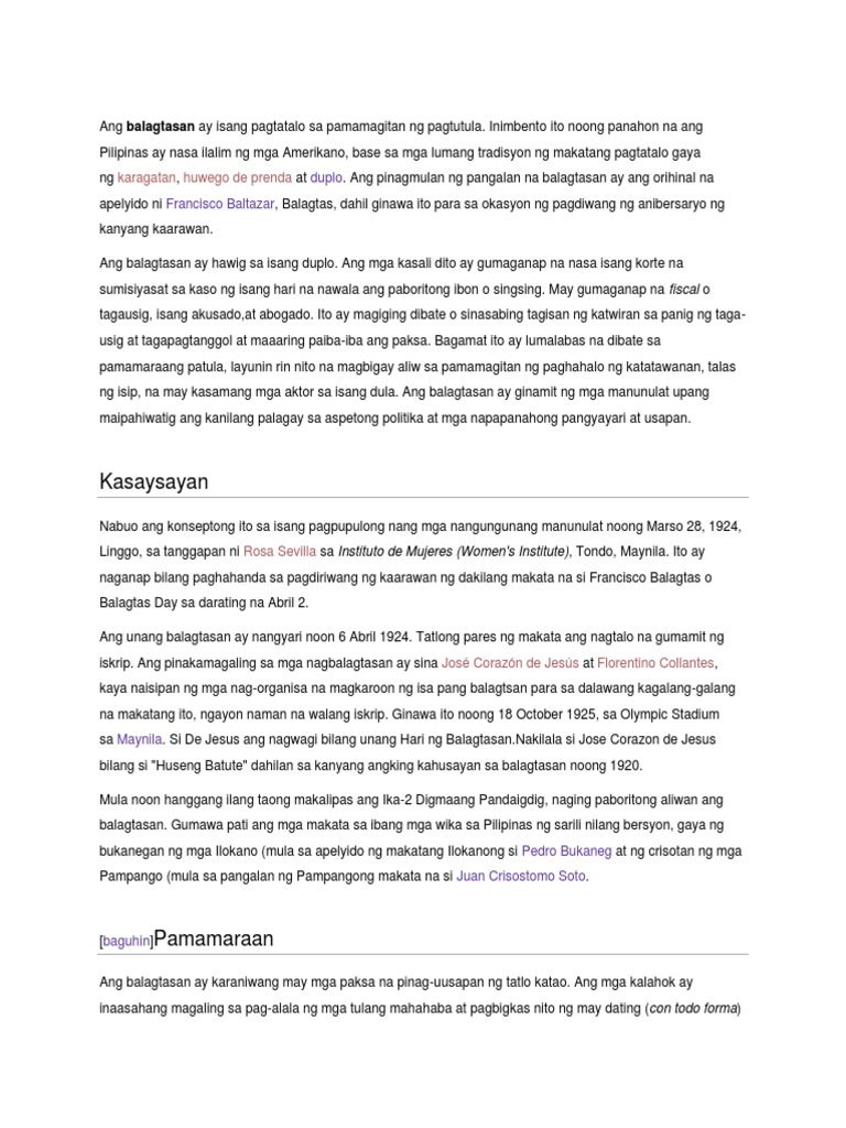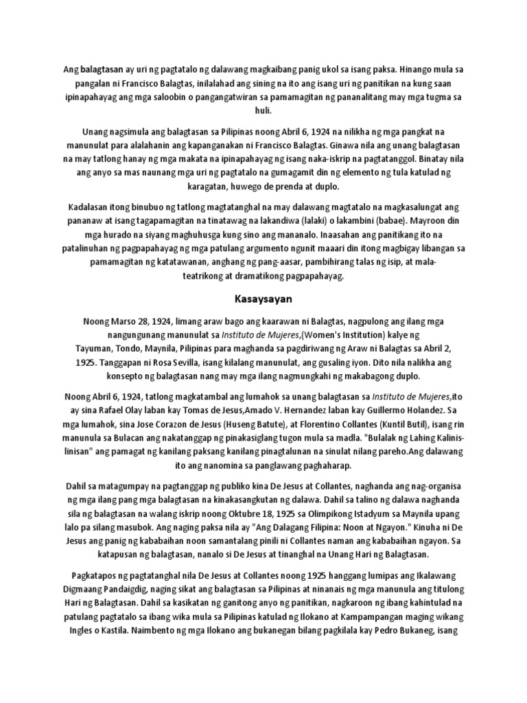 Dalawang mambabalagtas na nagtatalo sa isang paksa at isang lakandiwa na nagpapadaloy ng palitan ng katwiran. Example ng 4 paragraph. Unang nagsimula ang balagtasan sa Pilipinas noong Abril 6 1924 na nilikha.