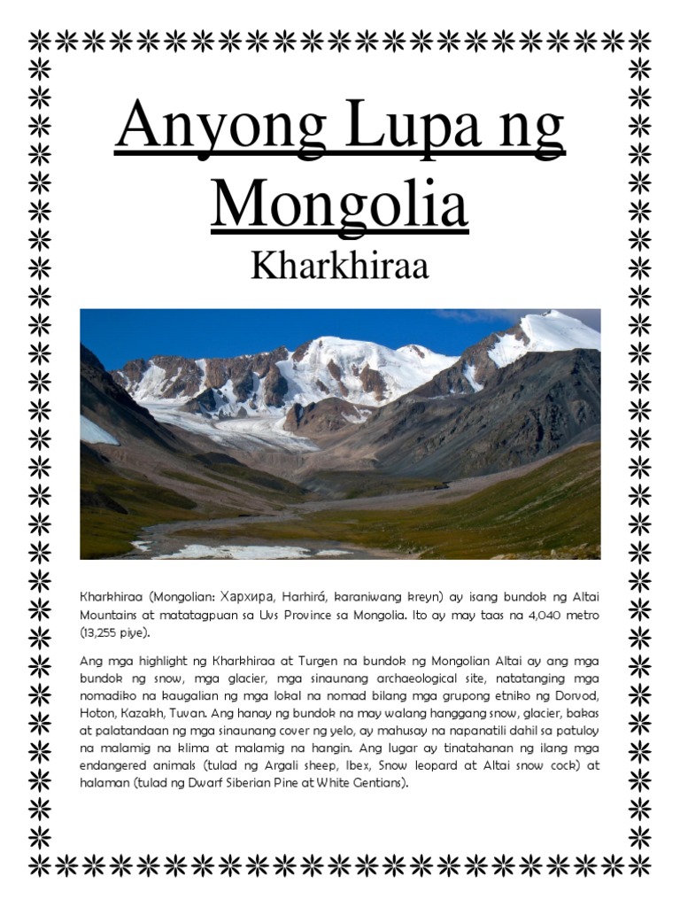 Saan matatagpuan ang mongolia. Edad na kasali sa polo y servicioa. Ang Tian Shan na nangangahulugang Bundok ng Langit. Ang Hiten Peak sa kanluran ng bansa ay ang pinakamataas na lupain na umaabot ng 4 374 metro.