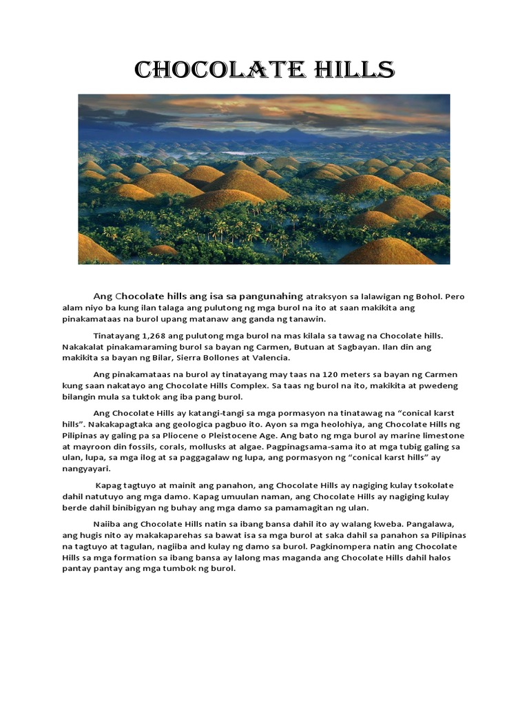 Feb 06 2018 Kinikilala ang Bohol dahil sa ibat-ibang uri ng magagandang tanawin na nakapalibot nito. Dinarayo ang Chocolate Hills dahil sa 1268 na burol na pumapalibot sa islang Bohol. Tutuusin maaari na nating tawaging na perpektong tsokolate ang Chocolate Hills dahil sa perpektong pagkahubog.