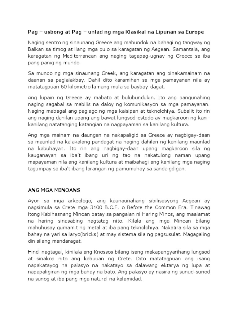 Aug 12 2016 ang_kabihasnang_minoanang kabihasnang minoan- unang sumibol sa isla ng crete bago magkaroon ng sibilisasyon sa Greecemarunong sila maglinang ng gintoat bronse at may sistema na sila sa panulatSIBILISASYONG MINOAN-Ang sibilisasyong ito ang may pinakamataas na antas ng kaunlaran at kultura sa Europa-Mayroon silang sistema ng pagsulat kasanayan sa pagahahabi paggawa ng. Dito nagmula ang Kabihasnang Mycenaean. 1kinahanglan ba nga atong mahibaloan ang mga lugar nga sensiibo sa pe.