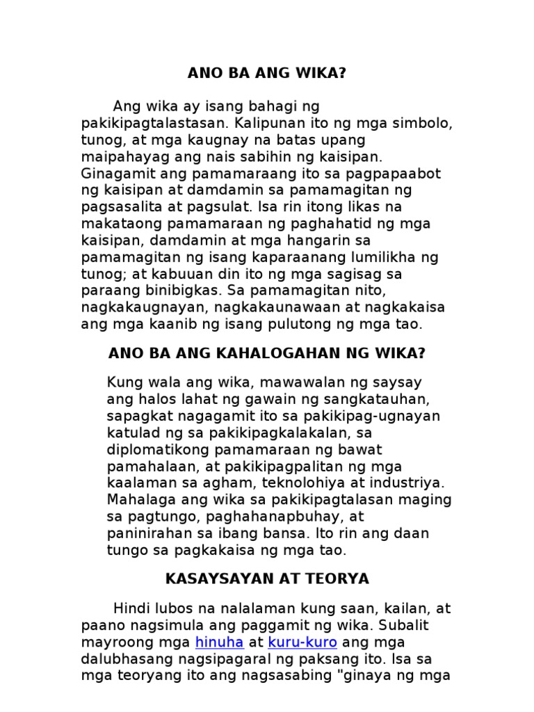 Jun 17 2012 Wika is the dialect. Jun 25 2019 Ayon sa teoryang ito nagmula ang wika sa mga walang kahulugang bulalas ng mga tao na nasuwertehang nakalikha at iniugnay sa mga bagay-bagay sa paligid. Pero hanggang ngayon di parin masagot kung saan talaga.