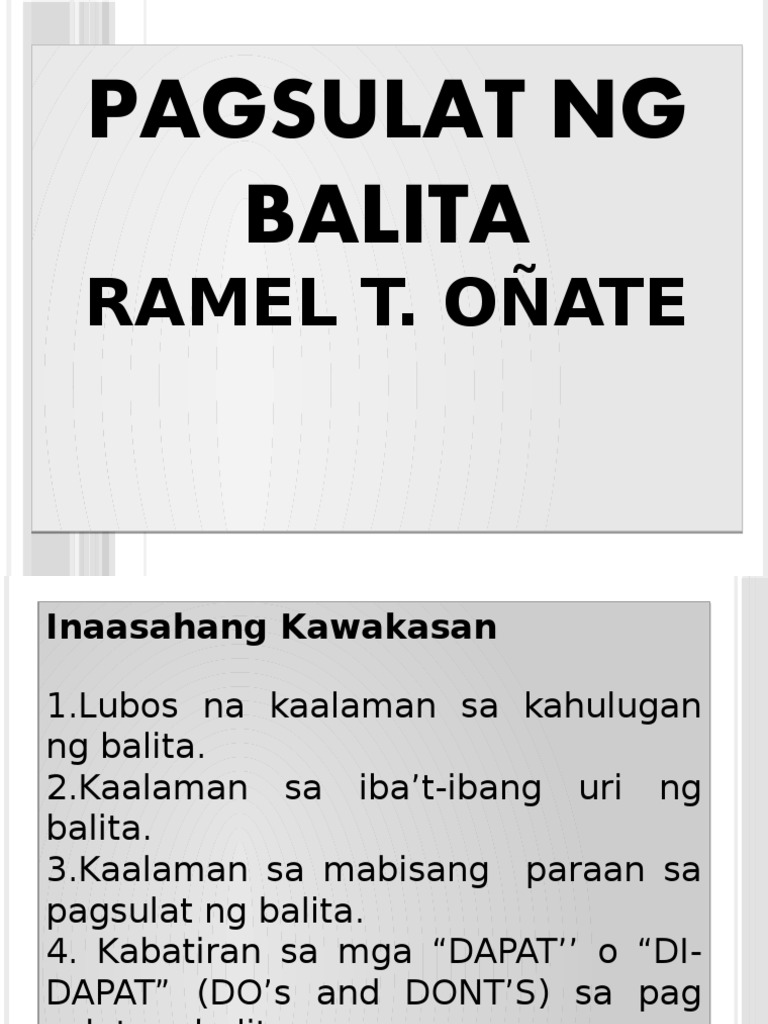 Naririto rin ang mga krosword komiks at horoscope. Jul 22 2016 Tandaan Ang balita ay maikli at maliwanag na paglalahadSinisimulan ang balita sa pinakamahalagang impormasyon tungo sa di- gaanong mahalagang detalye Ang patnubay o unang talataan ang sumasagot sa mga tanong na ano sino kailan saan bakit paano Ang pamagat ng balita ay batay sa uri ng talataan o patnubayIto ay isinusulat sa.
