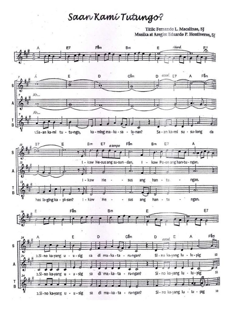 Saan kami susulong dahas laging kapisan. Music and Lyrics by Fernando Macalinao SJ and Eduardo Eddie Hontiveros SJ. Choose one of the browsed Saan Kami Tutungo lyrics get the lyrics and watch the video.